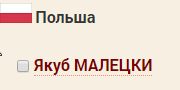 - Zjeżdżamy na dół szukając polskiej flagi i zaznaczamy puste pole przy nazwisku Якуб МАЛЕЦКИ