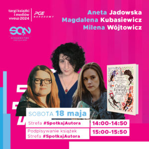 14:00 -14:50  – strefa #SpotkajAutora – ANETA JADOWSKA, MAGDALENA KUBASIEWICZ, MILENA WÓJTOWICZ (15:00 – 15:50 – strefa #SpotkajAutora – podpisywanie książki „Cztery żywioły magii”)