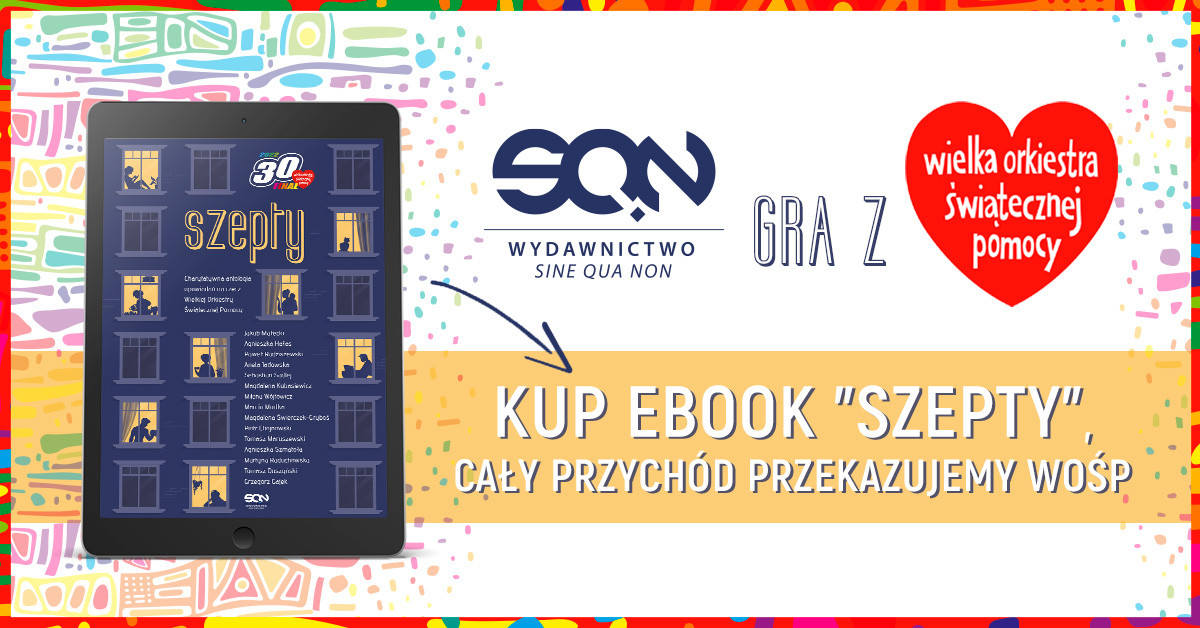 Wydawnictwo SQN ruszyło z akcją „30 tys. zł na 30. Finał WOŚP”. Dorzucając swoją cegiełkę na rzecz orkiestry, razem z piętnastoma autorami stworzyliśmy ebook Szepty, a Cały przychód ze sprzedaży antologii przekazany zostanie Wielkiej Orkiestrze Świątecznej Pomocy. Piętnastu pisarzy i piętnaście opowiadań w wyjątkowym... → czytaj więcej