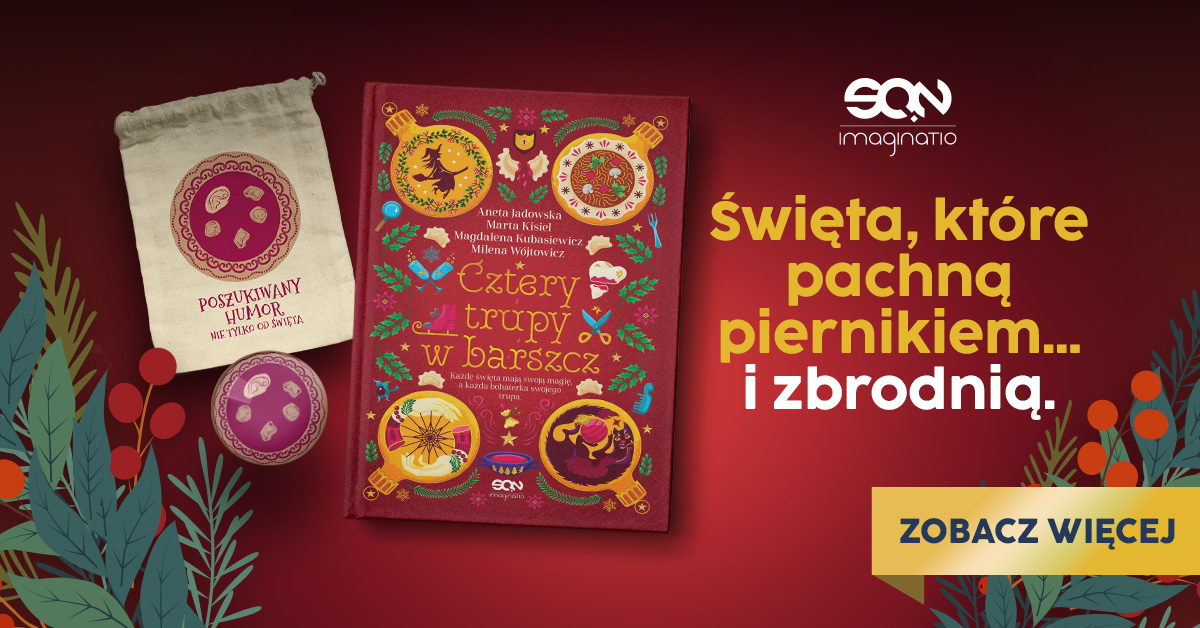 Jako naczelny Grinch Internetu muszę przyznać, że ta antologia odczarowała mi trochę Święta! Nie pomyślałabym, że będą do tego potrzebne cztery autorki, domowik z zapędami na „odpicuję Ci choinkę”, solidny gar bigosu i… kilka trupów, a tymczasem Cztery trupy w barszcz wchodzą lepiej, niż Kevin – i nie ma reklam!