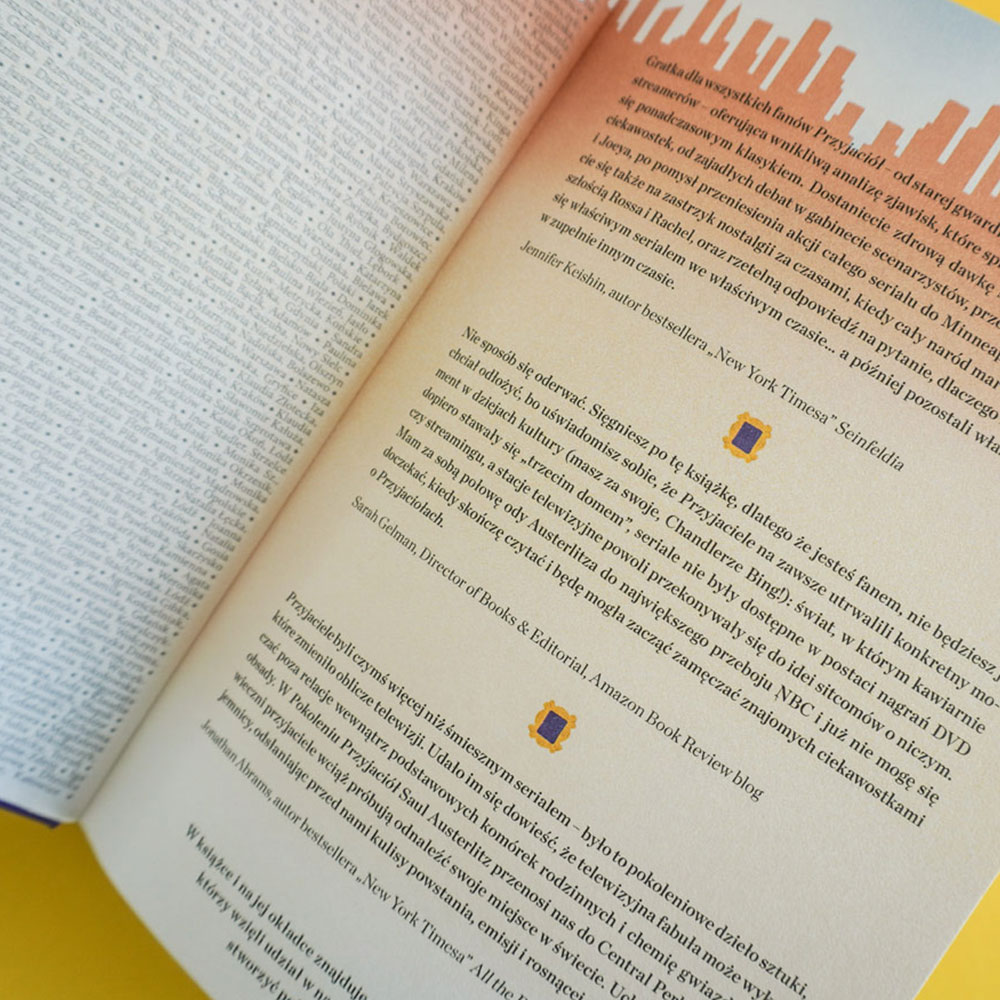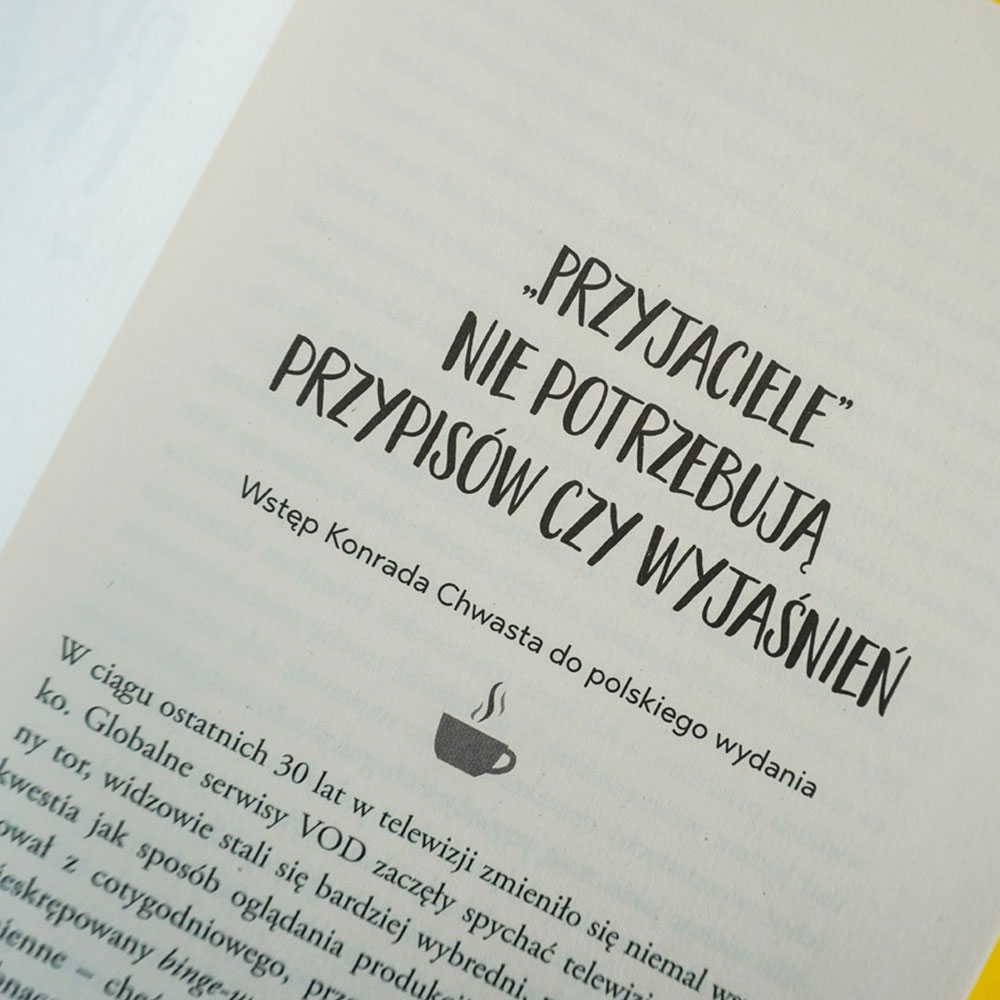 „Nie sposób się oderwać. Sięgniesz po tę książkę, dlatego że jesteś fanem, nie będziesz jej chciał odłożyć, bo uświadomisz sobie, że Przyjaciele na zawsze utrwalili konkretny moment w dziejach kultury (masz za swoje, Chandlerze Bing!): świat, w którym kawiarnie dopiero stawały się „trzecim domem”, seriale nie były dostępne w postaci nagrać DVR czy streamingu, a stacje telewizyjne powoli przekonywały się idei sitcomów o niczym. Mam za sobą połowę ody Austerlitza do największego przeboju NBC i już nie mogę się doczekać, kiedy skończę czytać i będę mogła zacząć zamęczać znajomych ciekawostkami o Przyjaciołach”.