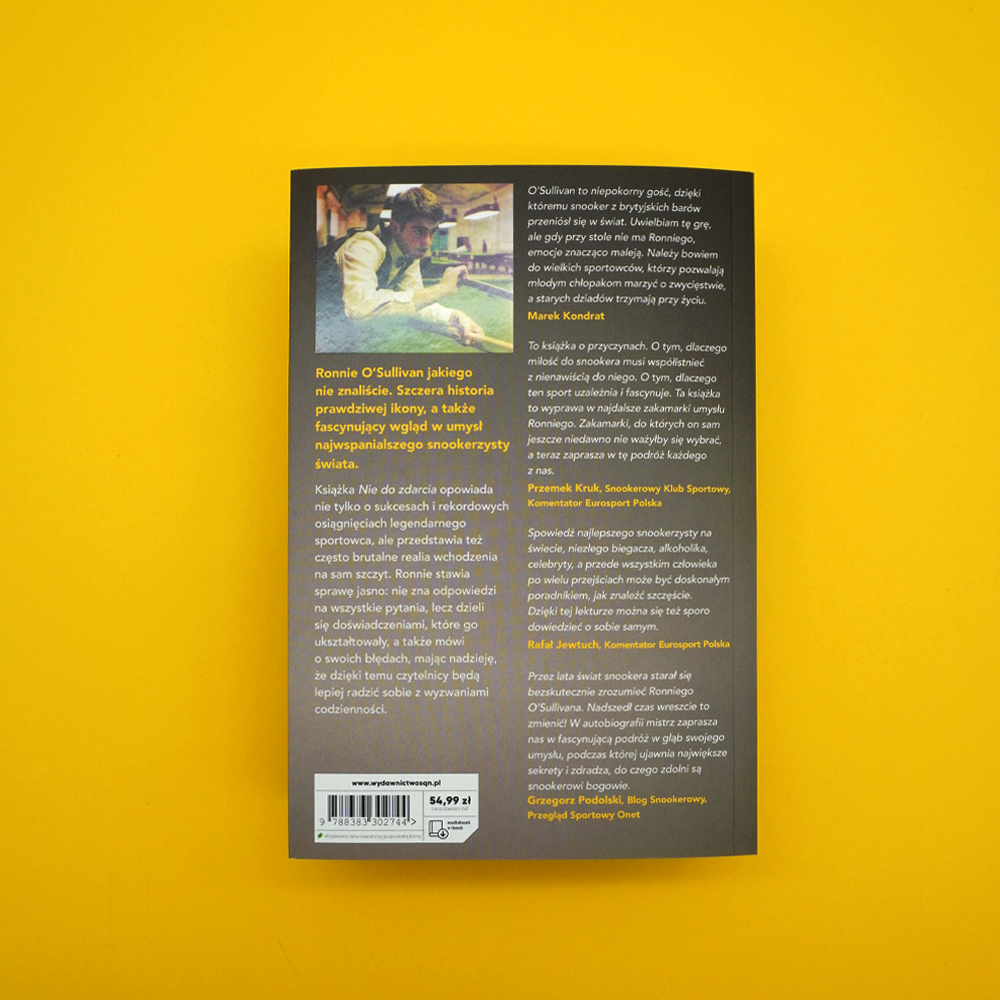 To książka o przyczynach. O tym, dlaczego miłość do snookera musi współistnieć z nienawiścią do niego. O tym, dlaczego ten sport uzależnia i fascynuje. Ta książka to wyprawa w najdalsze zakamarki umysłu Ronniego. Zakamarki, do których on sam jeszcze niedawno nie ważyłby się wybrać, a teraz zaprasza w tę podróż każdego z nas.