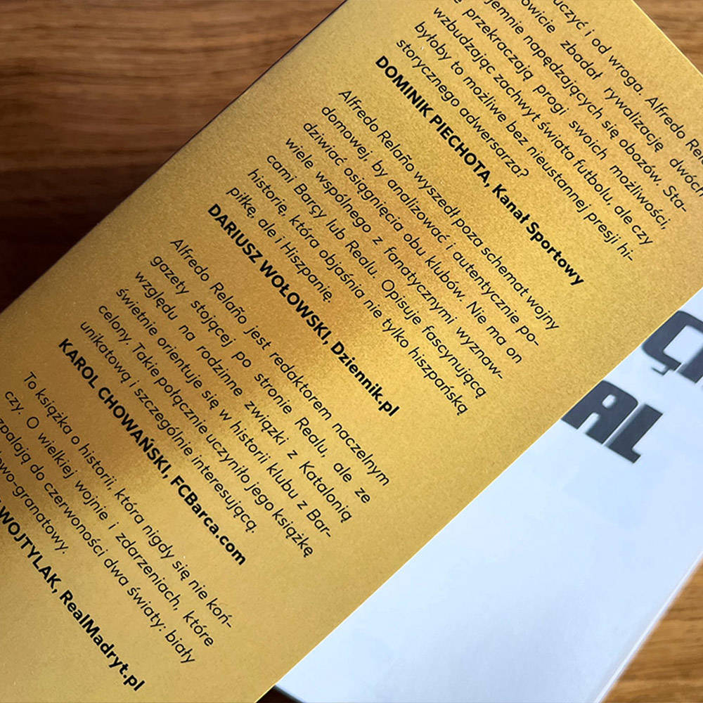 Alfredo Relaño wyszedł poza schemat wojny domowej, by analizować i autentycznie podziwiać osiągnięcia obu klubów. Nie ma on wiele wspólnego z fanatycznymi wyznawcami Barçy lub Realu. Opisuje fascynującą historię, która objaśnia nie tylko hiszpańską piłkę, ale i Hiszpanię.