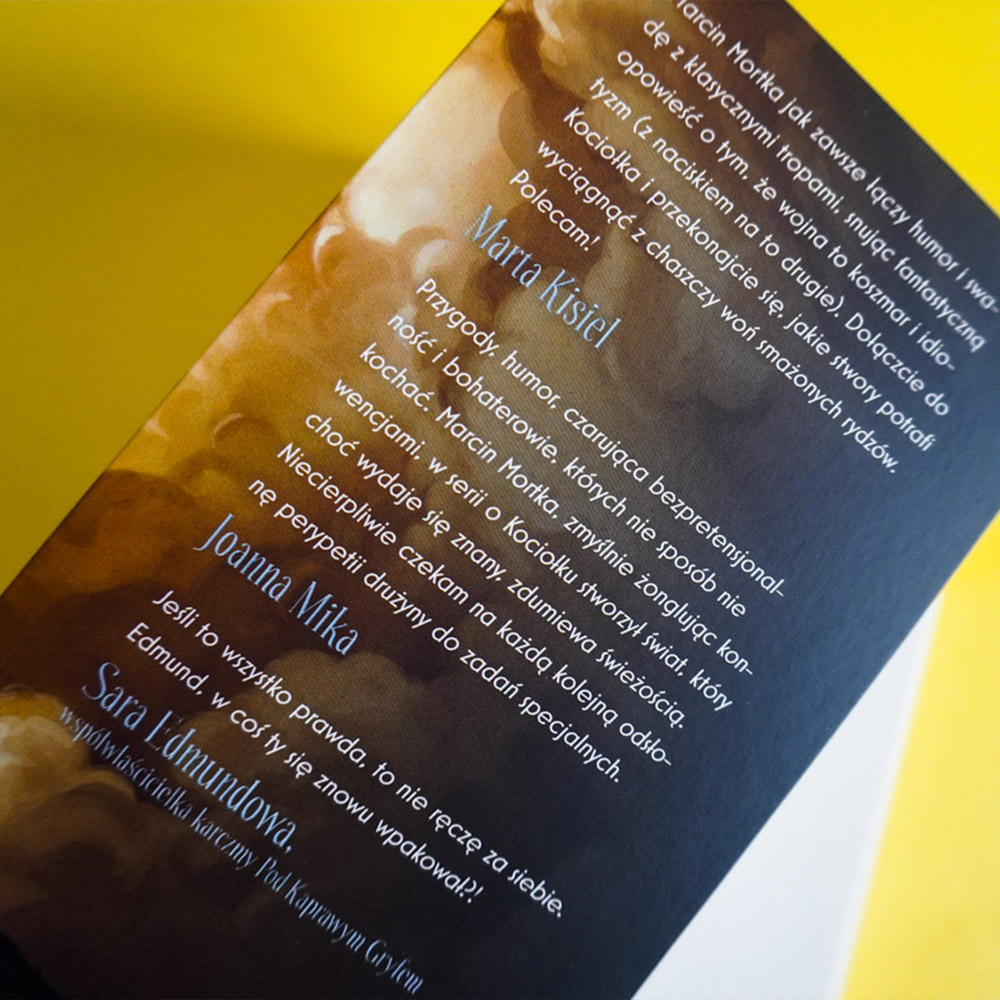Marcin Mortka jak zawsze łączy humor i swadę z klasycznymi tropami, snując fantastyczną opowieść o tym, że wojna to koszmar i idiotyzm (z naciskiem na to drugie). Dołączcie do Kociołka i przekonajcie się, jakie stwory potrafi wyciągnąć z chaszczy woń smażonych rydzów. Polecam!