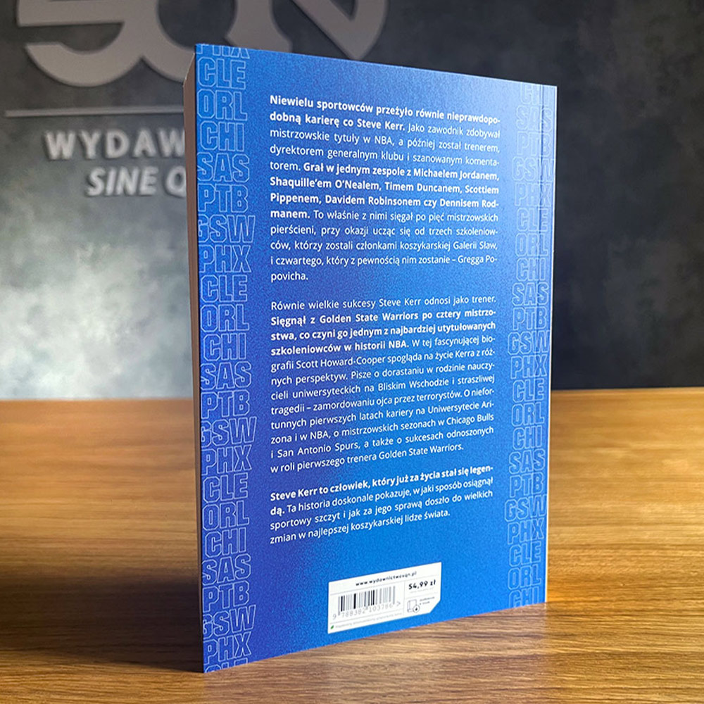 Równie wielkie sukcesy Steve Kerr odnosi jako trener. Sięgnął z Golden State Warriors po cztery mistrzowskie tytuły, co czyni go jednym z najbardziej utytułowanych szkoleniowców w historii NBA. W tej fascynującej biografii Scott Howard-Cooper spogląda na życie Kerra z różnych perspektyw. Pisze o dorastaniu w rodzinie nauczycieli uniwersyteckich na Bliskim Wschodzie i straszliwej tragedii – zamordowaniu ojca przez terrorystów. O niefortunnych pierwszych latach kariery na uniwersytecie Arizona i w NBA, o mistrzowskich sezonach w Chicago Bulls i San Antonio Spurs, a także o sukcesach odnoszonych w roli pierwszego trenera Golden State Warriors.